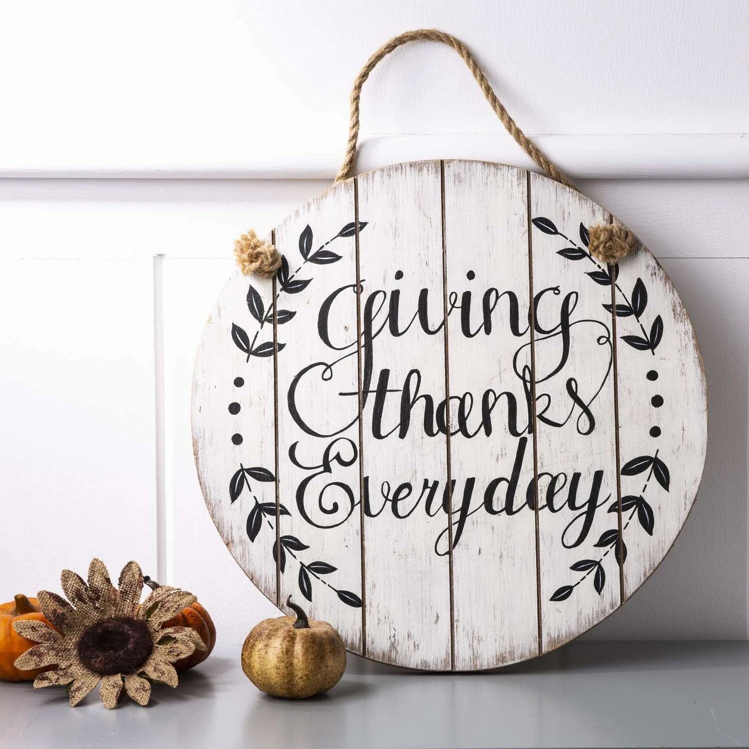 This round “giving thanks everyday” Wall Decor was created to resemble the lids of old, wooden shipping barrels. With an artistic and weathered design, applied solid wood and an encouraging sentiment paired on top this piece creates the perfect addition to any room.No assembly requiredHang it on the wall with jute ropeMade primarily by real wood