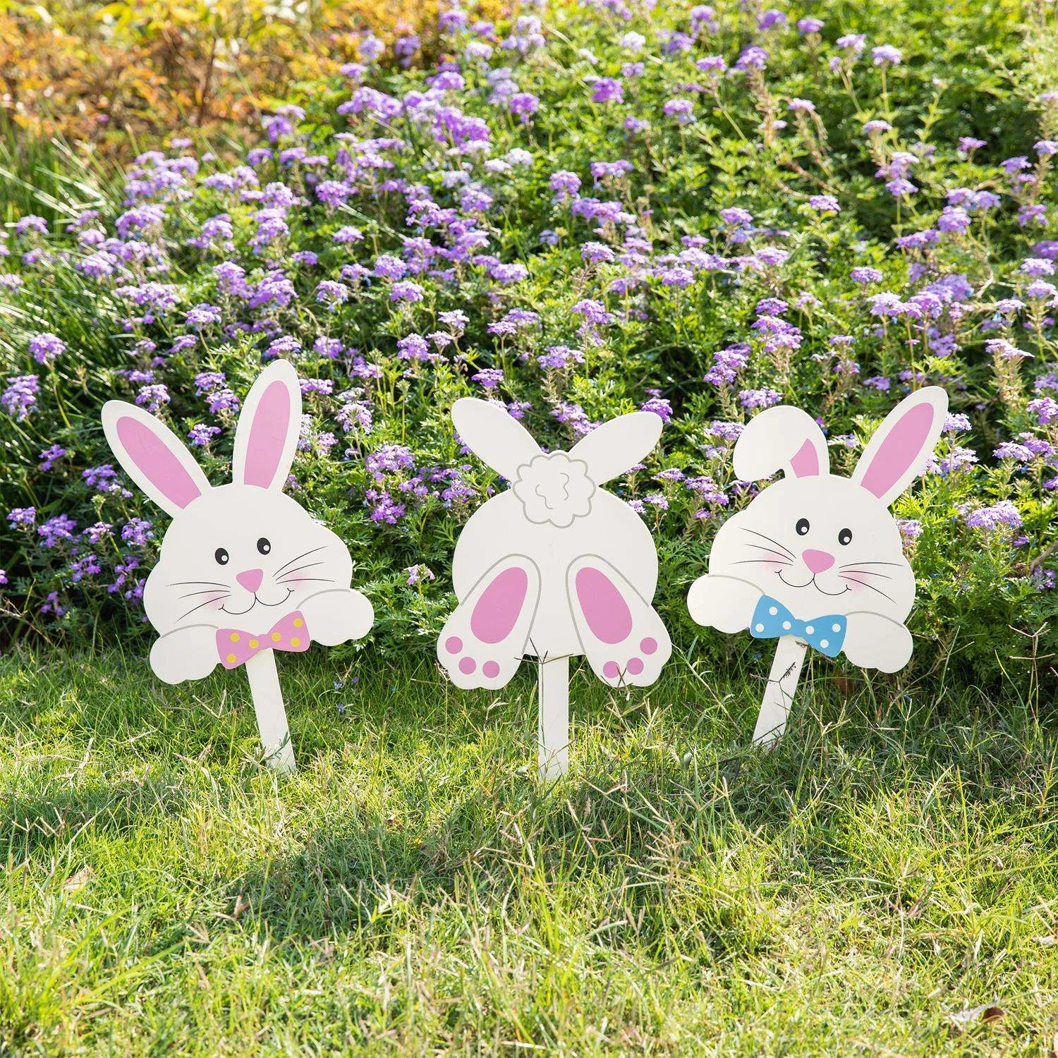 The set of 3 wooden Bunny Stake adds an eye-catching addition to your garden in Easter and spring. It also offers a delightful way to greet guests on the front porch, or to add a splash of color and character out on back yard.Unique and cute bunny shape signNo assembly requiredEasy to install